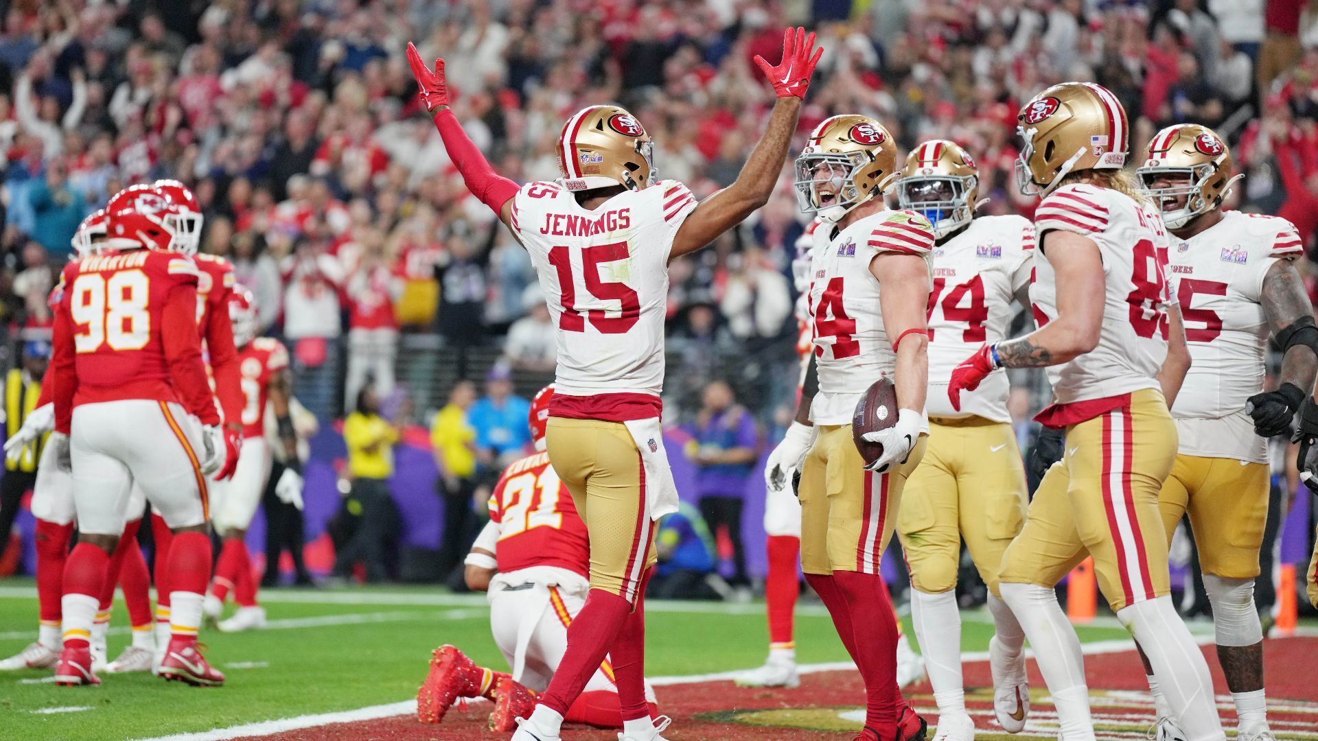 - Him catching a 10-yard TD by winning against stud Chiefs CB L’Jarius Sneed and bodying his way into the end zone. It wasn’t that big of a joke to suggest Jennings had a legit chance to win MVP at this point in the game (the official NFL X account even suggested it).