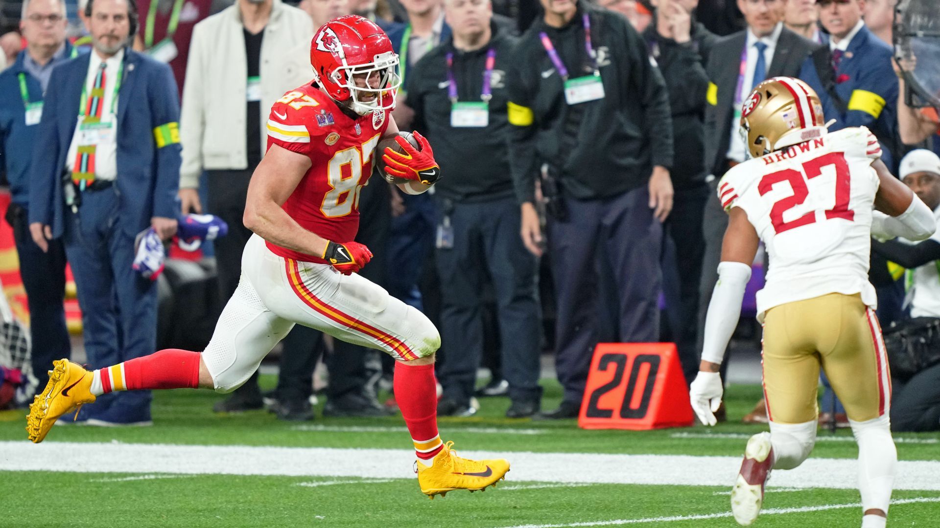 Feb 11, 2024; Paradise, Nevada, USA; Kansas City Chiefs tight end Travis Kelce (87) runs with the ball against San Francisco 49ers safety Ji'Ayir Brown (27) during the fourth quarter of Super Bowl LVIII at Allegiant Stadium. Mandatory Credit: Kyle Terada-USA TODAY Sports