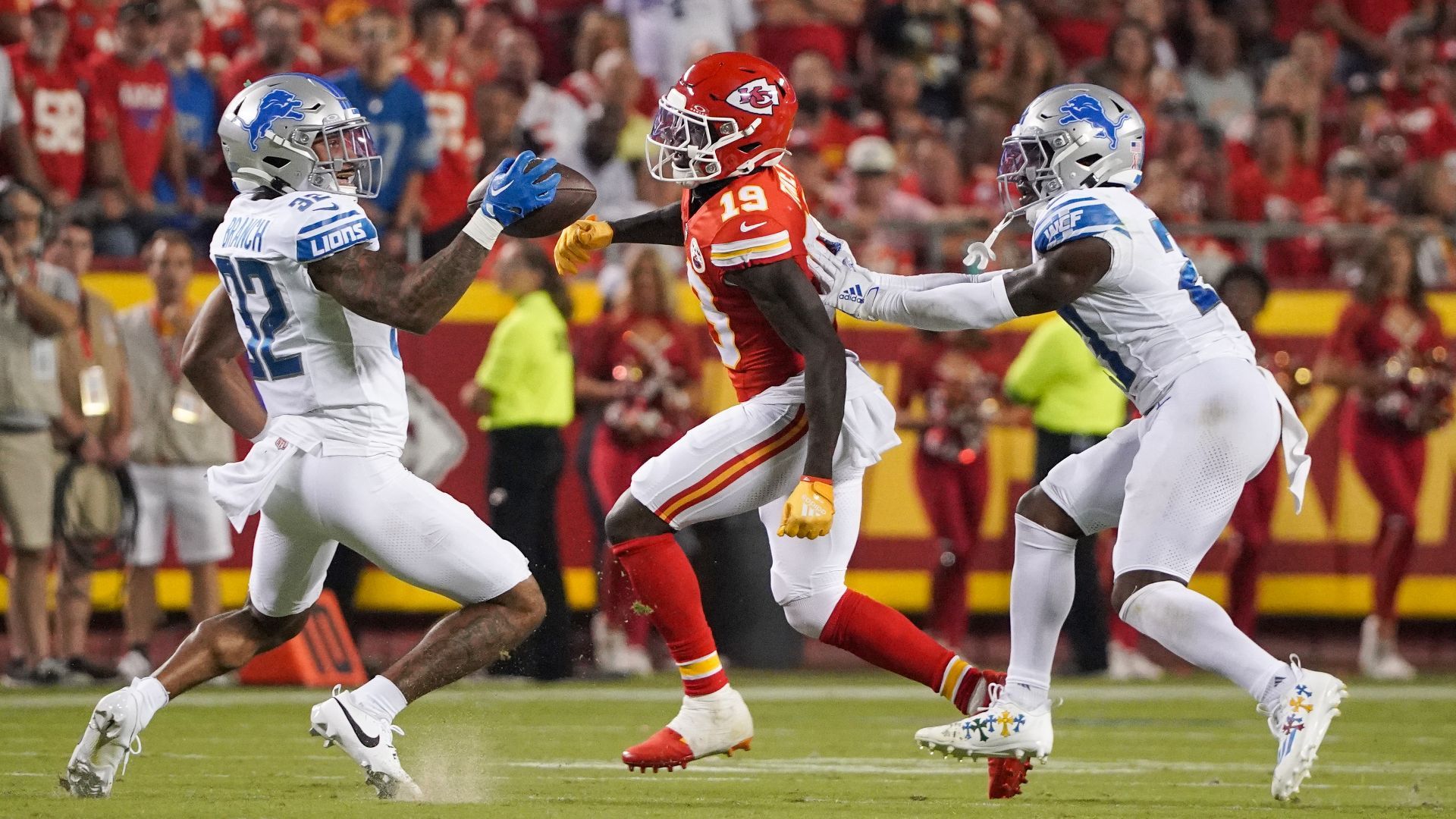 Sep 7, 2023; Kansas City, Missouri, USA; Detroit Lions safety Brian Branch (32) intercepts a pass intended for Kansas City Chiefs wide receiver Kadarius Toney (19) during the second half at GEHA Field at Arrowhead Stadium. Mandatory Credit: Denny Medley-USA TODAY Sports