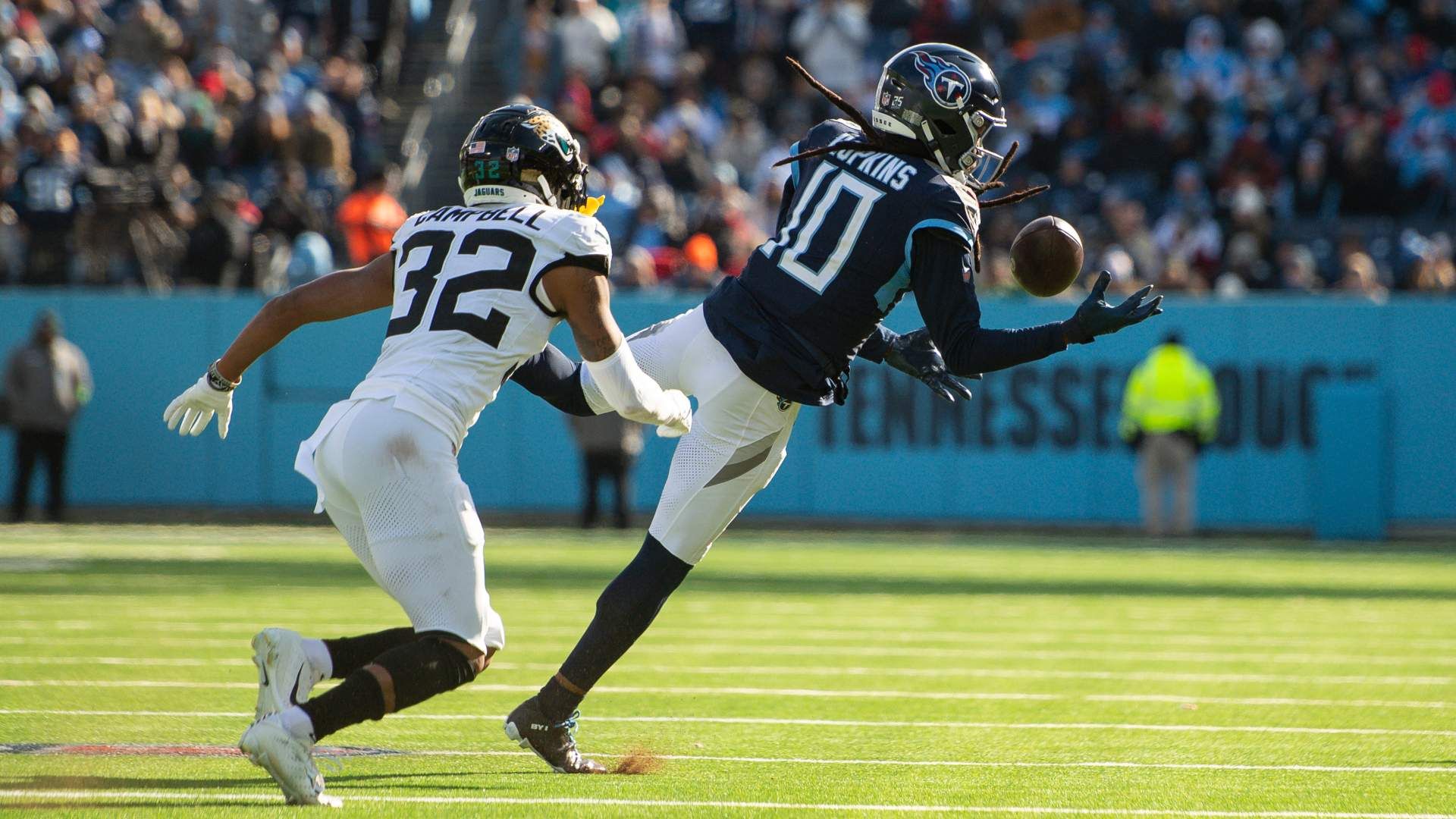 Jan 7, 2024; Nashville, Tennessee, USA; Tennessee Titans wide receiver DeAndre Hopkins (10) makes a one handed catch against the Jacksonville Jaguars during the first half at Nissan Stadium. Mandatory Credit: Steve Roberts-USA TODAY Sports