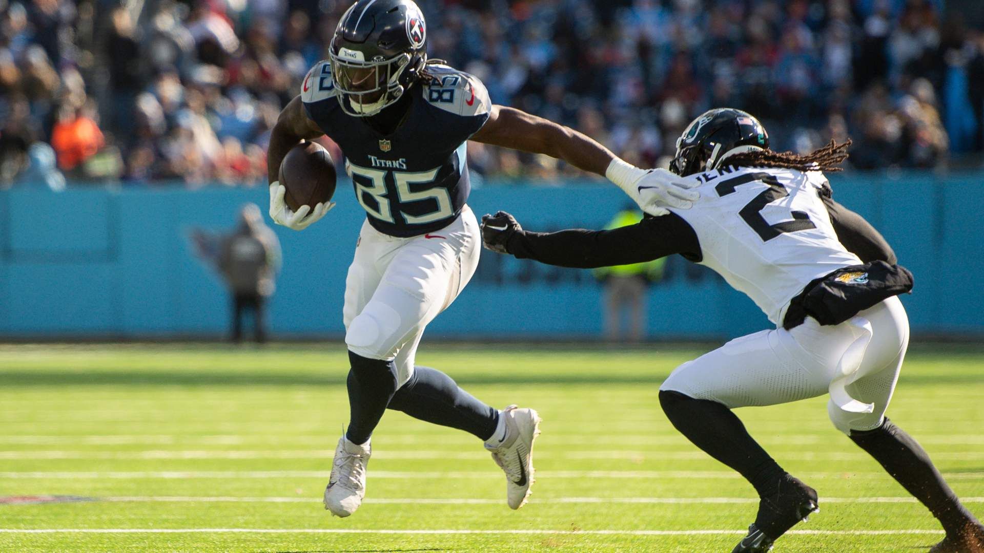 Jan 7, 2024; Nashville, Tennessee, USA; Tennessee Titans tight end Chigoziem Okonkwo (85) stiff arms Jacksonville Jaguars safety Rayshawn Jenkins (2) during the first half at Nissan Stadium. Mandatory Credit: Steve Roberts-USA TODAY Sports