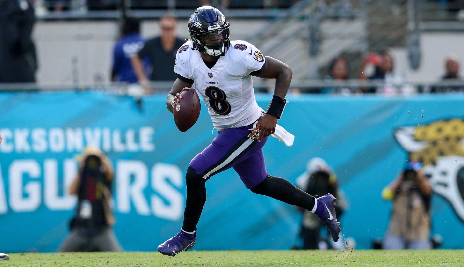 Nov 27, 2022; Jacksonville, Florida, USA; Baltimore Ravens quarterback Lamar Jackson (8) runs with the ball against the Jacksonville Jaguars in the second quarter at TIAA Bank Field. Mandatory Credit: Nathan Ray Seebeck-USA TODAY Sports