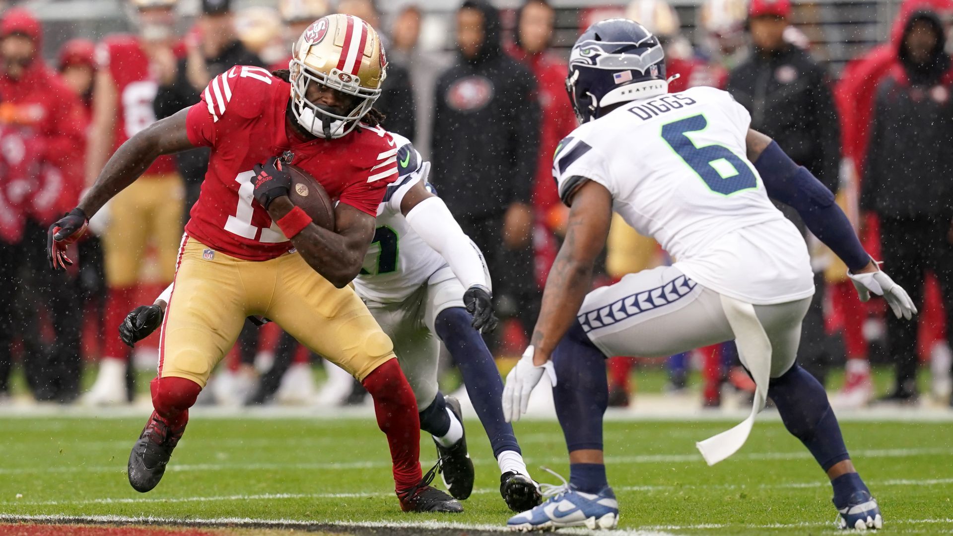 Jan 14, 2023; Santa Clara, California, USA; San Francisco 49ers wide receiver Brandon Aiyuk (11) is defended by Seattle Seahawks safety Quandre Diggs (6) in the first quarter during a wild card game at Levi's Stadium. Mandatory Credit: Cary Edmondson-USA TODAY Sports