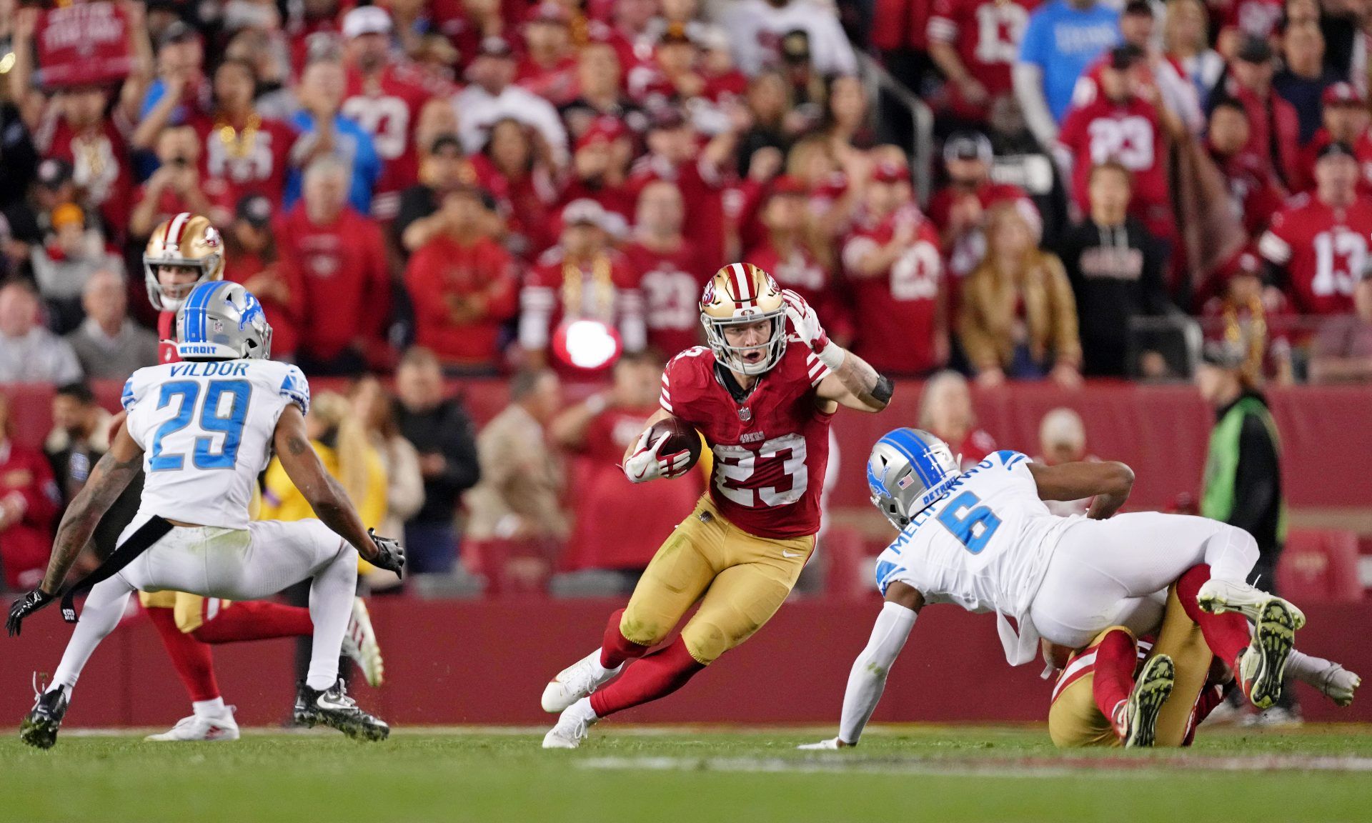 Jan 28, 2024; Santa Clara, California, USA; San Francisco 49ers running back Christian McCaffrey (23) runs with the ball against the Detroit Lions during the second half of the NFC Championship football game at Levi's Stadium. Mandatory Credit: Kyle Terada-USA TODAY Sports