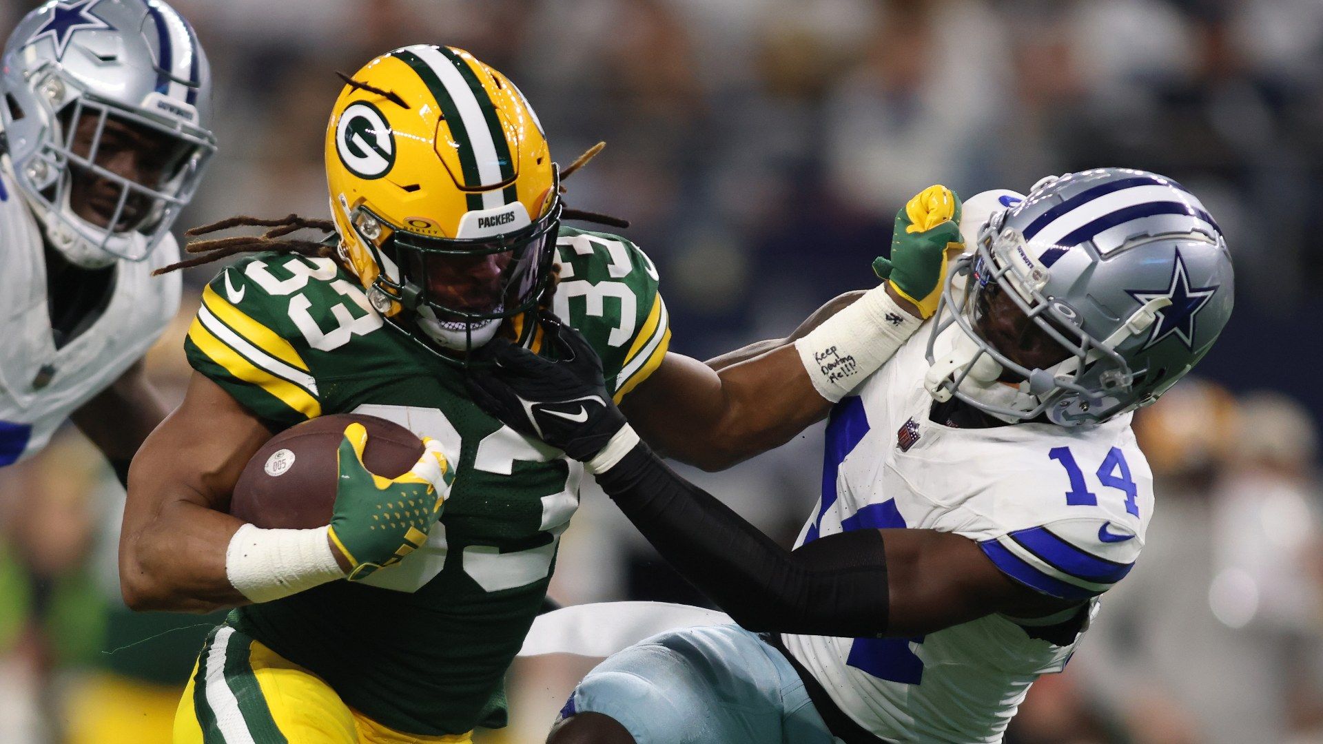 Jan 14, 2024; Arlington, Texas, USA; Green Bay Packers running back Aaron Jones (33) rushes the ball against Dallas Cowboys safety Markquese Bell (14) in the first quarter for the 2024 NFC wild card game at AT&T Stadium. Mandatory Credit: Tim Heitman-USA TODAY Sports