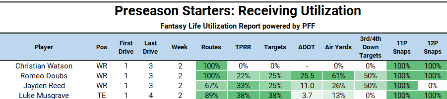 Jayden Reed is the starting slot WR (67% participation in Week 2) and could carve out more work as the season progresses. Romeo Doubs is having a great preseason and is clearly ahead for now, but Reed has a stronger collegiate profile and wasn’t limited to slot work at Michigan State.
