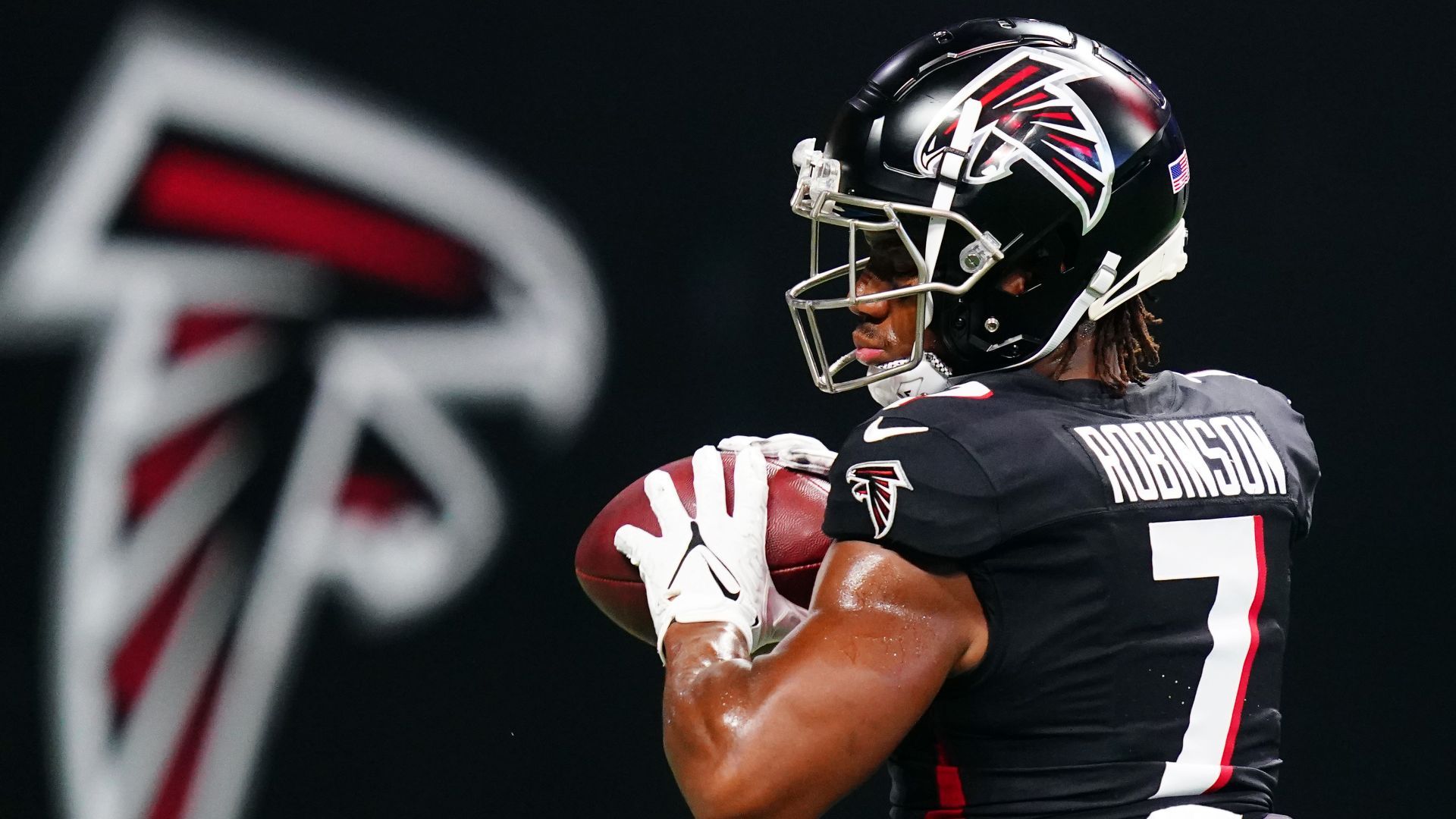 Aug 18, 2023; Atlanta, Georgia, USA; Atlanta Falcons running back Bijan Robinson (7) pulls down a catch during pregame warmups before their game against the Cincinnati Bengals at Mercedes-Benz Stadium. Mandatory Credit: John David Mercer-USA TODAY Sports