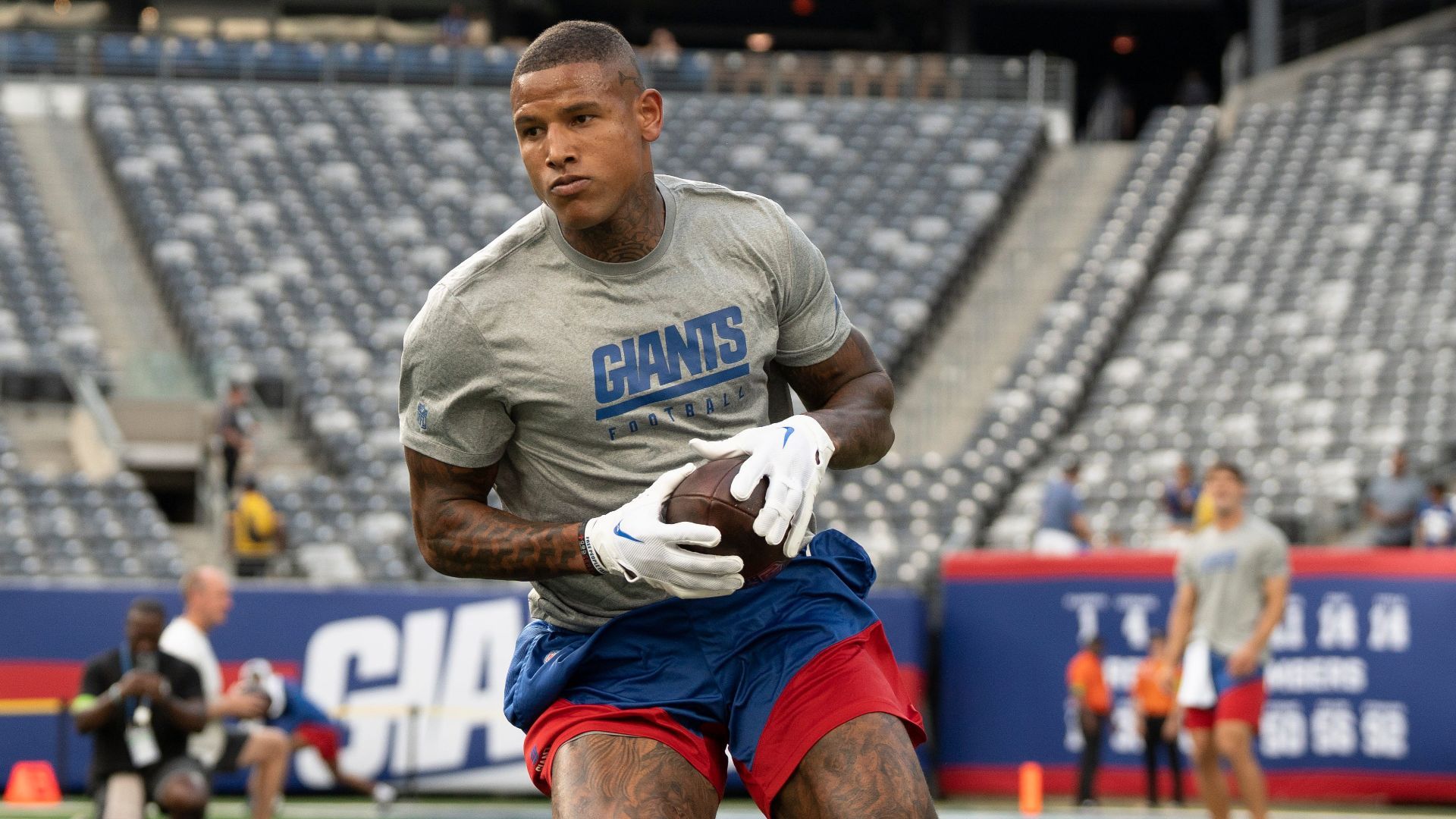 Aug 18, 2023; East Rutherford, NJ, USA; The Carolina Panthers vs. the New York Giants in an NFL preseason game at MetLife Stadium. New York Giants Darren Waller before the start of the game. Mandatory Credit: Michael Karas-The Record