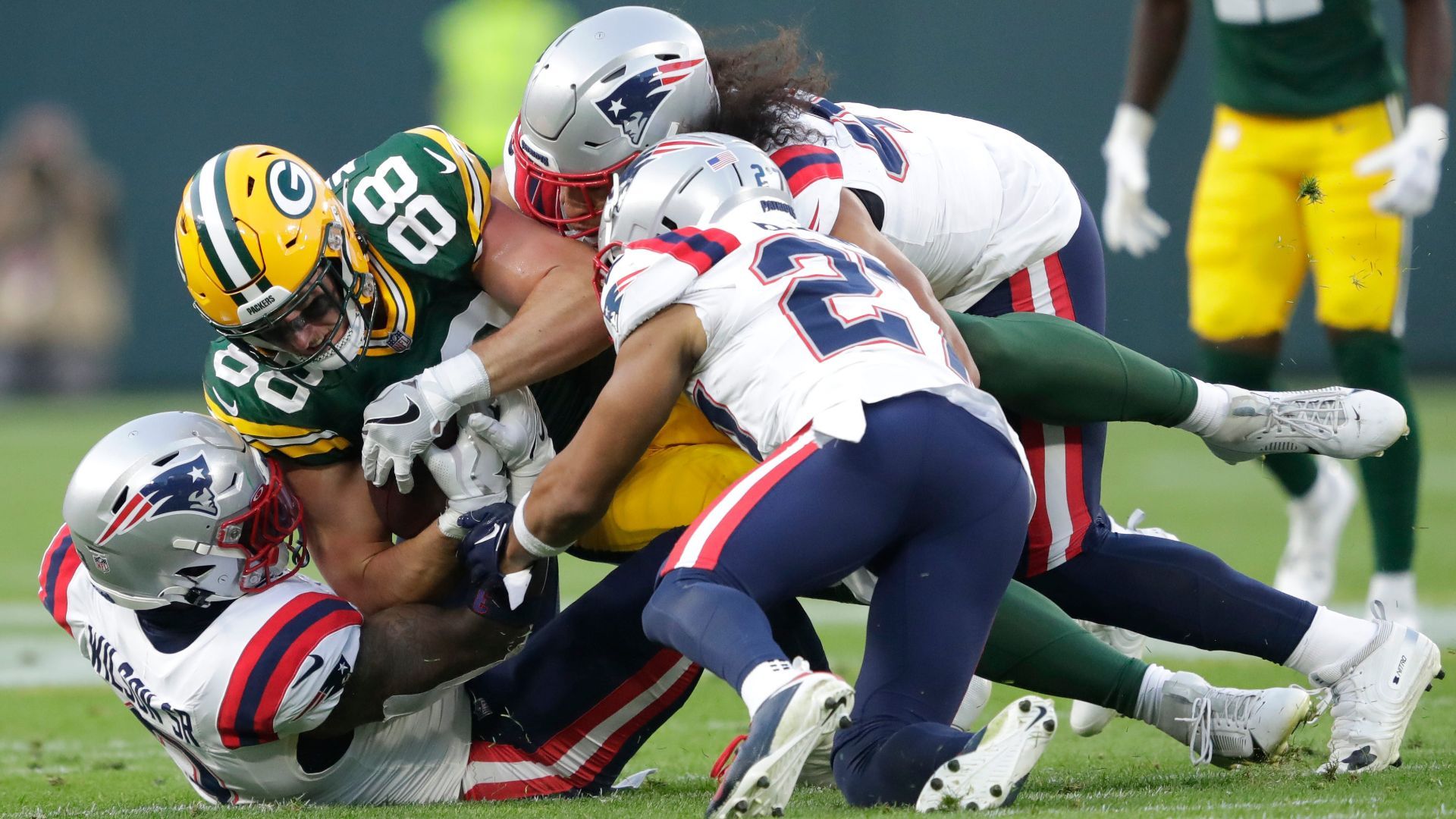 Green Bay Packers tight end Luke Musgrave (88) is brought down by New England Patriots defenders during their preseason football game Saturday, August 19, 2023, at Lambeau Field in Green Bay, Wis. Dan Powers/USA TODAY NETWORK-Wisconsin.