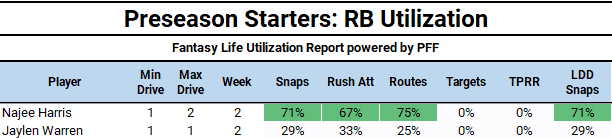 The Week 2 utilization also matched up with those sentiments, with Harris dominating 71% of the snaps and 67% of rushing attempts.