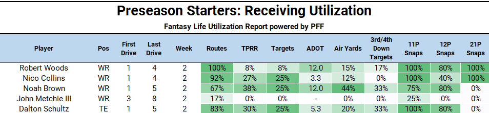 Houston played their starters in the first two weeks of the preseason, and Robert Woods, Nico Collins, and Dalton Schultz are all in line for significant playing time.