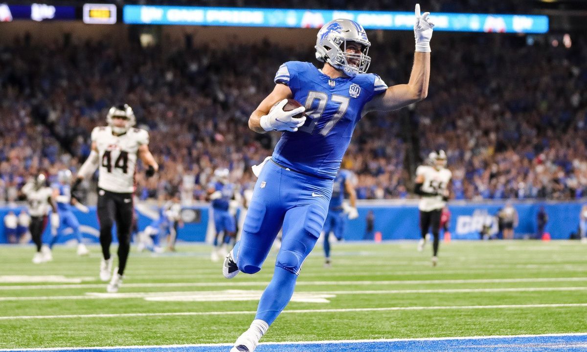 Detroit Lions tight end Sam LaPorta (87) makes a catch for a touchdown against Atlanta Falcons during the first half at Ford Field in Detroit on Sunday, Sept. 24, 2023.