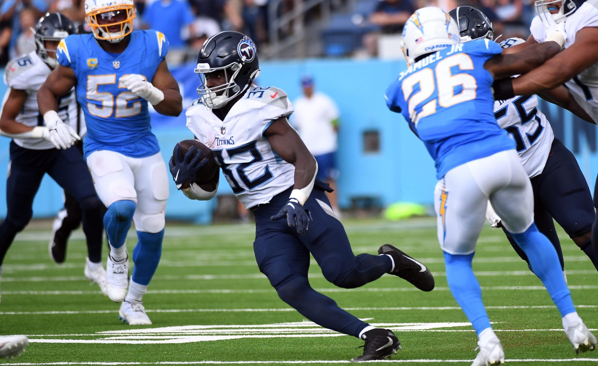 Sep 17, 2023; Nashville, Tennessee, USA; Tennessee Titans running back Tyjae Spears (32) runs for a first down after a reception in overtime against the Los Angeles Chargers at Nissan Stadium. Mandatory Credit: Christopher Hanewinckel-USA TODAY Sports