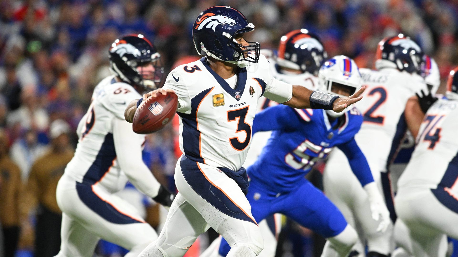 Nov 13, 2023; Orchard Park, New York, USA; Denver Broncos quarterback Russell Wilson (3) throws a pass in the second quarter against the Buffalo Bills at Highmark Stadium. Mandatory Credit: Mark Konezny-USA TODAY Sports