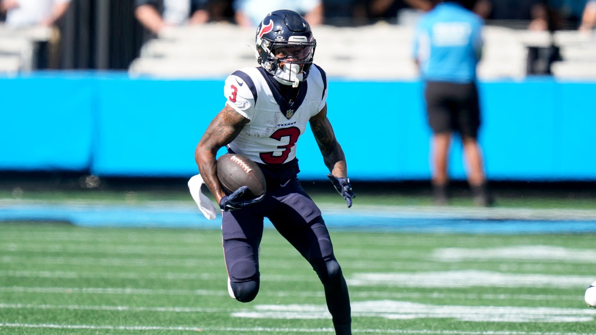 Oct 29, 2023; Charlotte, North Carolina, USA; Houston Texans wide receiver Tank Dell (3) runs for yardage against the Carolina Panthers during the first quarter at Bank of America Stadium. Mandatory Credit: Jim Dedmon-USA TODAY Sports