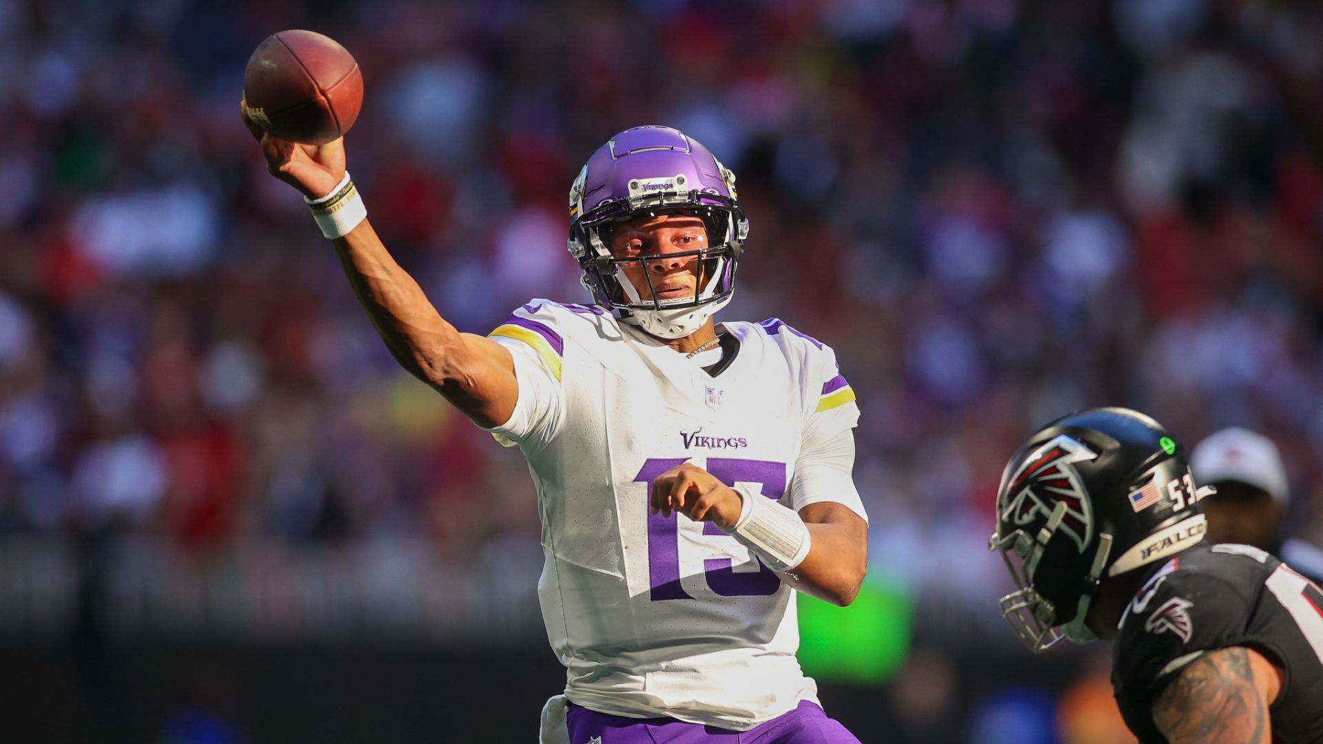 Nov 5, 2023; Atlanta, Georgia, USA; Minnesota Vikings quarterback Joshua Dobbs (15) throws a pass against the Atlanta Falcons in the second half at Mercedes-Benz Stadium. Mandatory Credit: Brett Davis-USA TODAY Sports