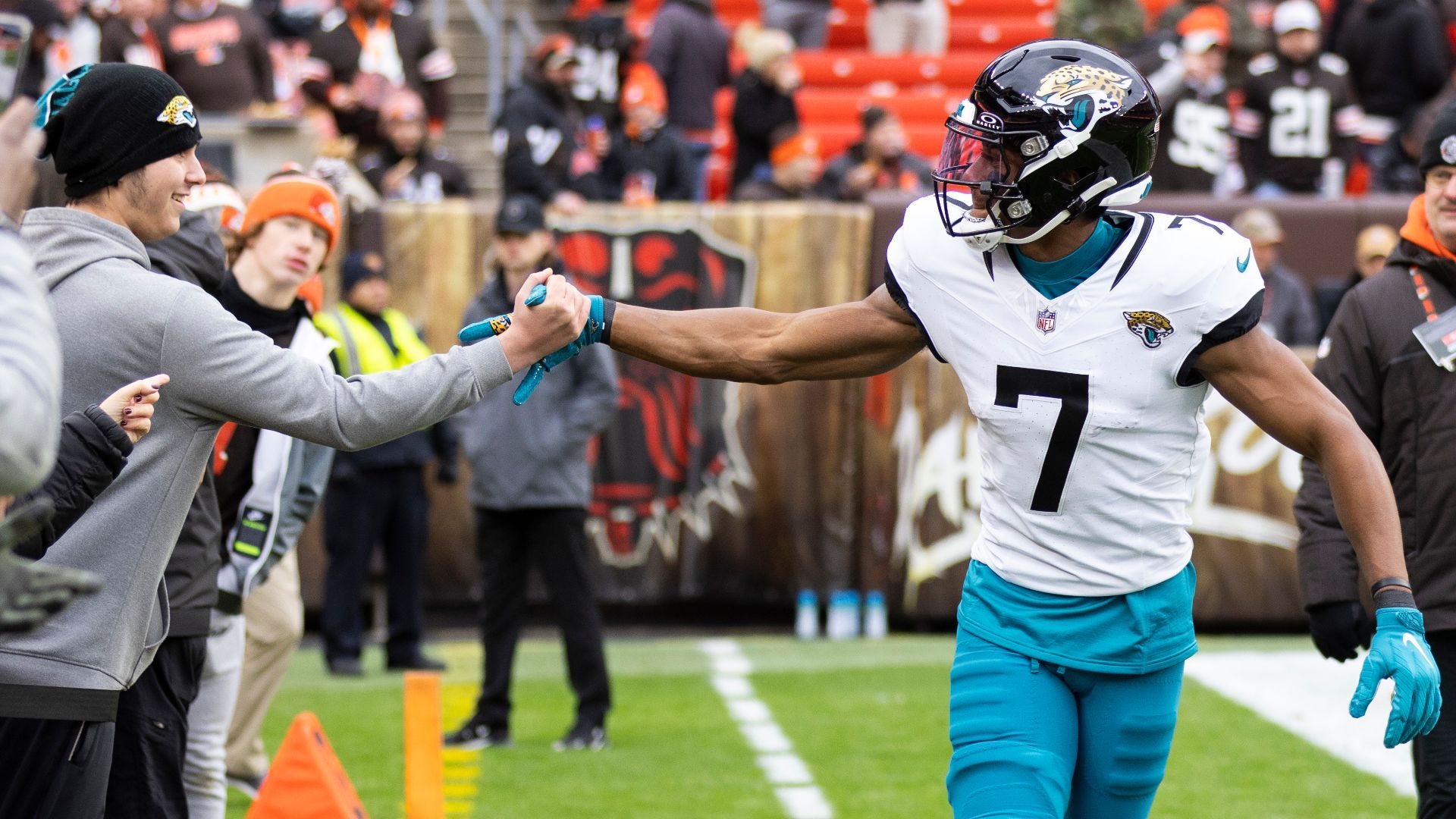 Dec 10, 2023; Cleveland, Ohio, USA; Jacksonville Jaguars wide receiver Zay Jones (7) slaps hands with a fan before the game against the Cleveland Browns at Cleveland Browns Stadium. Mandatory Credit: Scott Galvin-USA TODAY Sports
