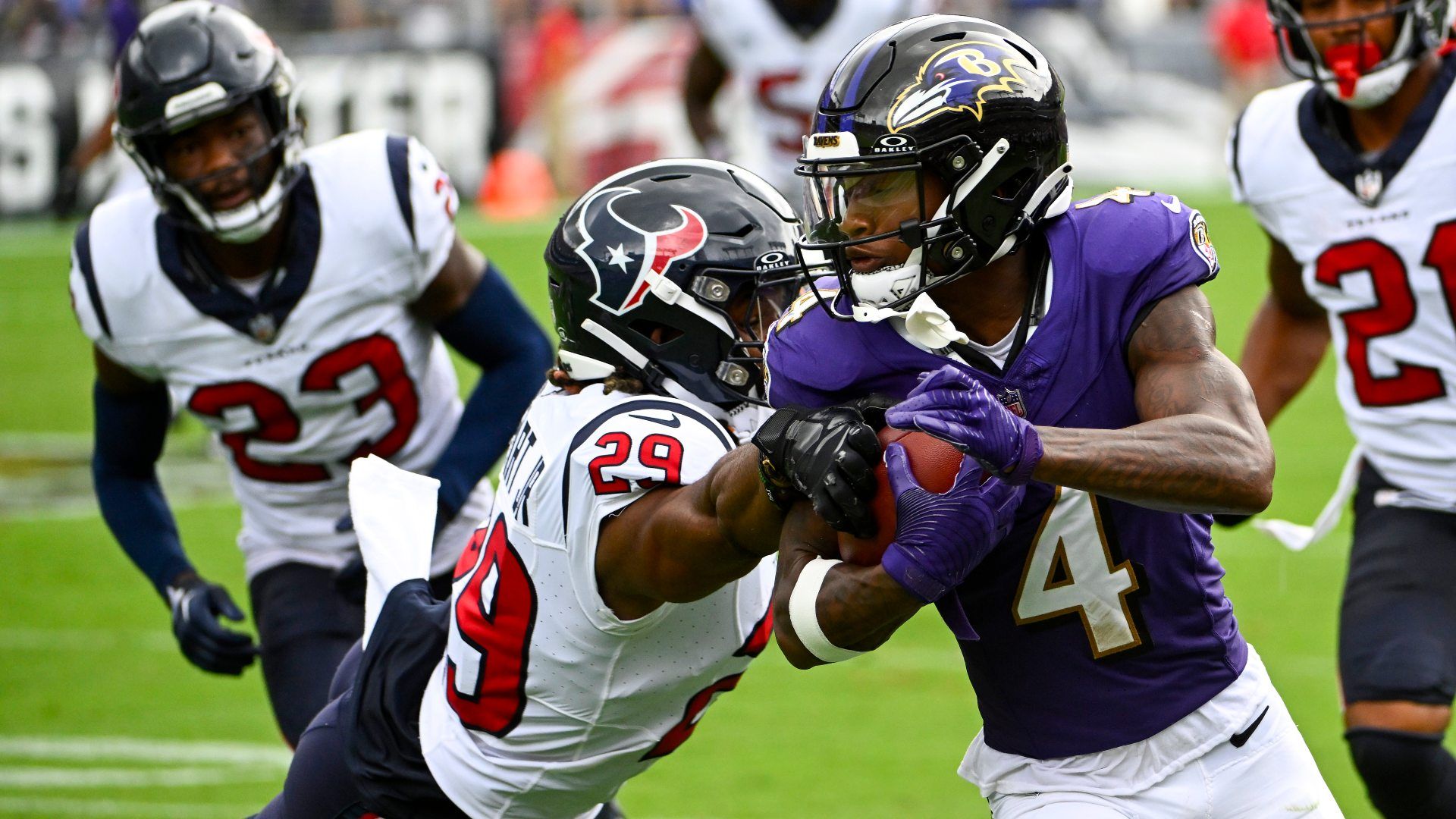 Sep 10, 2023; Baltimore, Maryland, USA; Baltimore Ravens wide receiver Zay Flowers (4) is tackled by Houston Texans safety M.J. Stewart (29) during the second half at M&T Bank Stadium. Mandatory Credit: Brad Mills-USA TODAY Sports