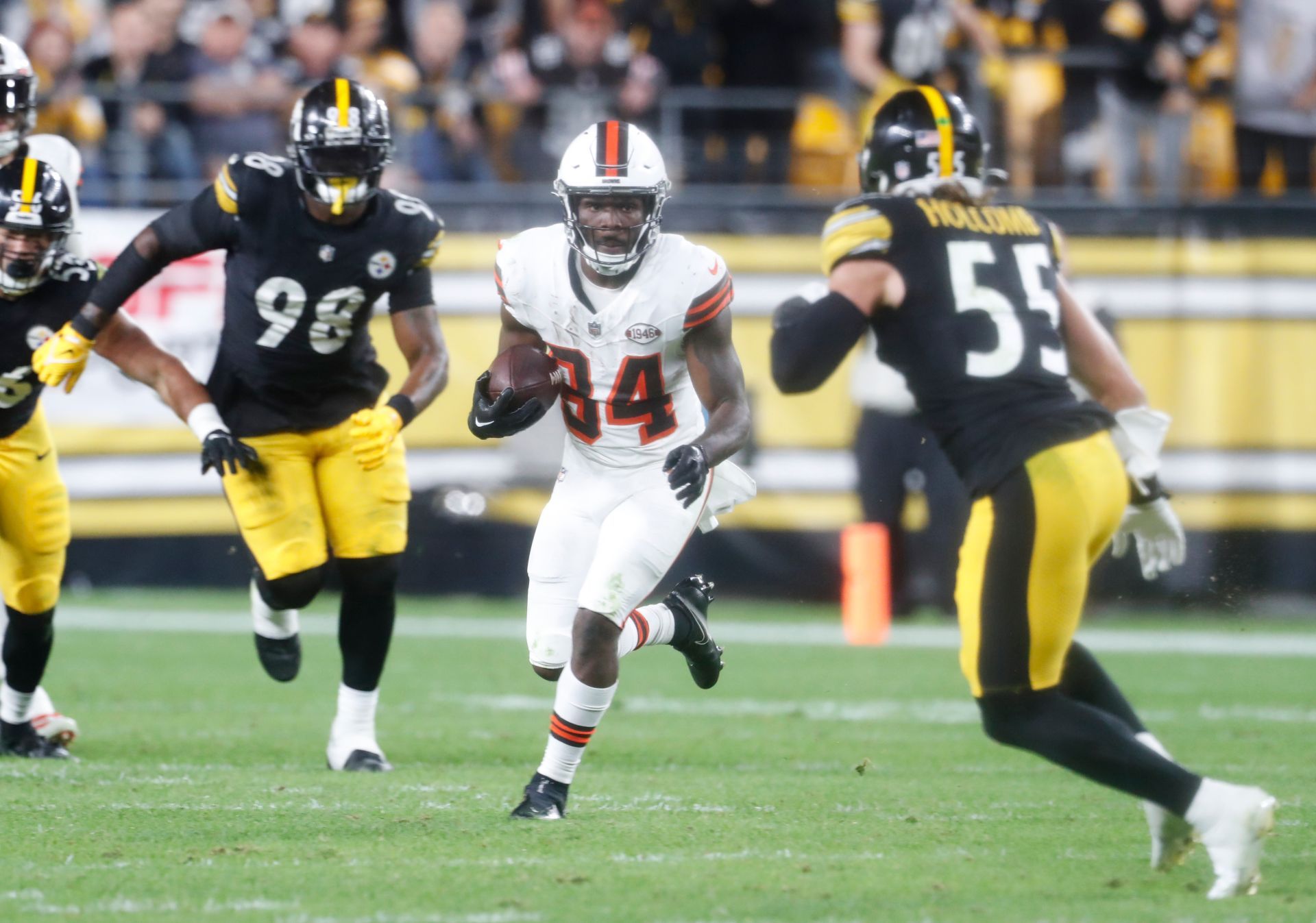 Sep 18, 2023; Pittsburgh, Pennsylvania, USA; Cleveland Browns running back Jerome Ford (34) carries the ball against the Pittsburgh Steelers during the third quarter at Acrisure Stadium. Pittsburgh won 26-22. Mandatory Credit: Charles LeClaire-USA TODAY Sports