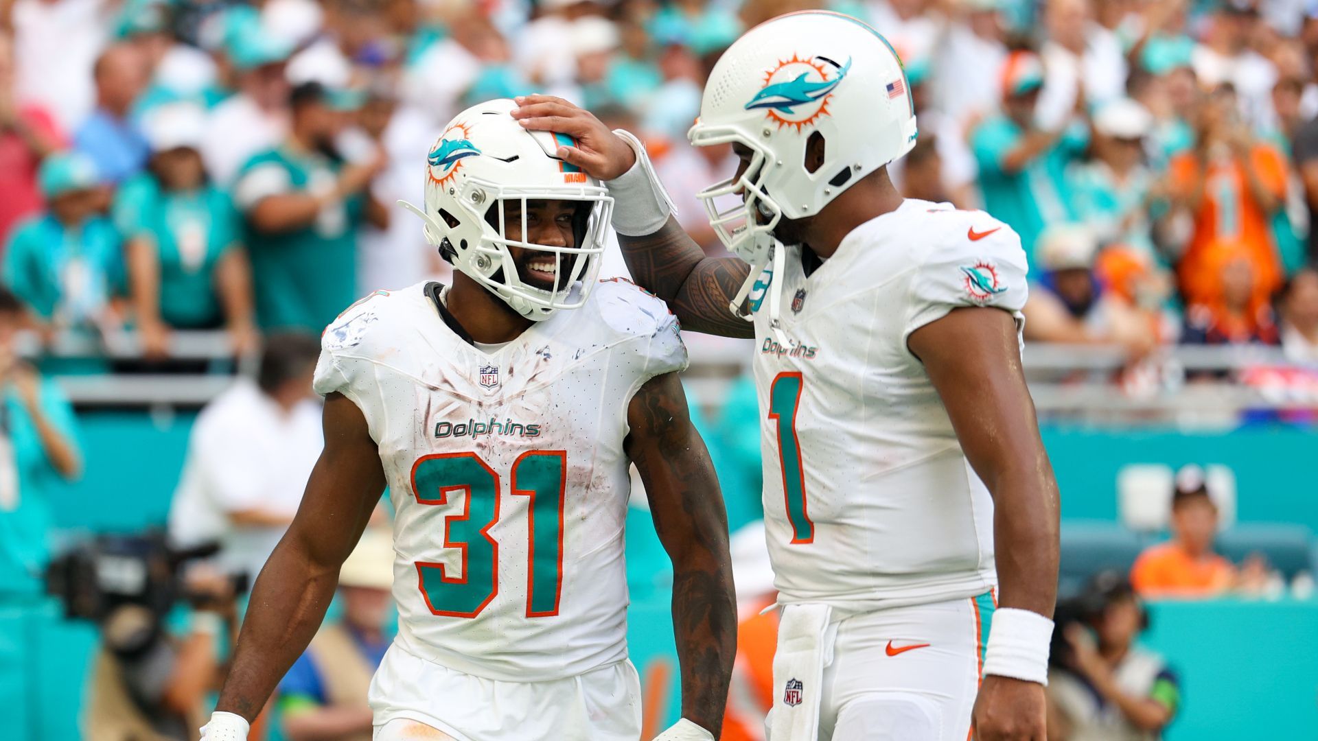 Sep 24, 2023; Miami Gardens, Florida, USA; Miami Dolphins quarterback Tua Tagovailoa (1) congratulates running back Raheem Mostert (31) after scoring a touchdown against the Denver Broncos in the third quarter at Hard Rock Stadium. Mandatory Credit: Nathan Ray Seebeck-USA TODAY Sports