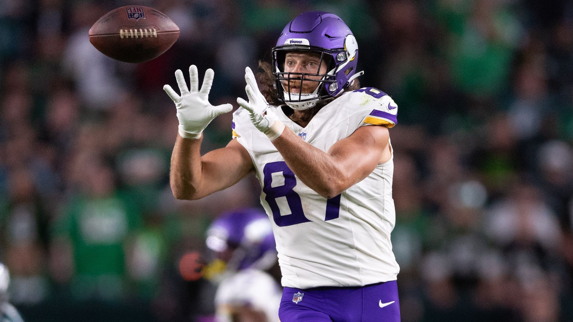 Sep 14, 2023; Philadelphia, Pennsylvania, USA; Minnesota Vikings tight end T.J. Hockenson (87) makes a catch against the Philadelphia Eagles during the fourth quarter at Lincoln Financial Field. Mandatory Credit: Bill Streicher-USA TODAY Sports
