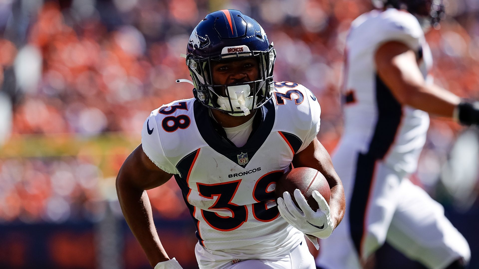 Sep 17, 2023; Denver, Colorado, USA; Denver Broncos running back Jaleel McLaughlin (38) runs for a touchdown in the first quarter against the Washington Commanders at Empower Field at Mile High. Mandatory Credit: Isaiah J. Downing-USA TODAY Sports