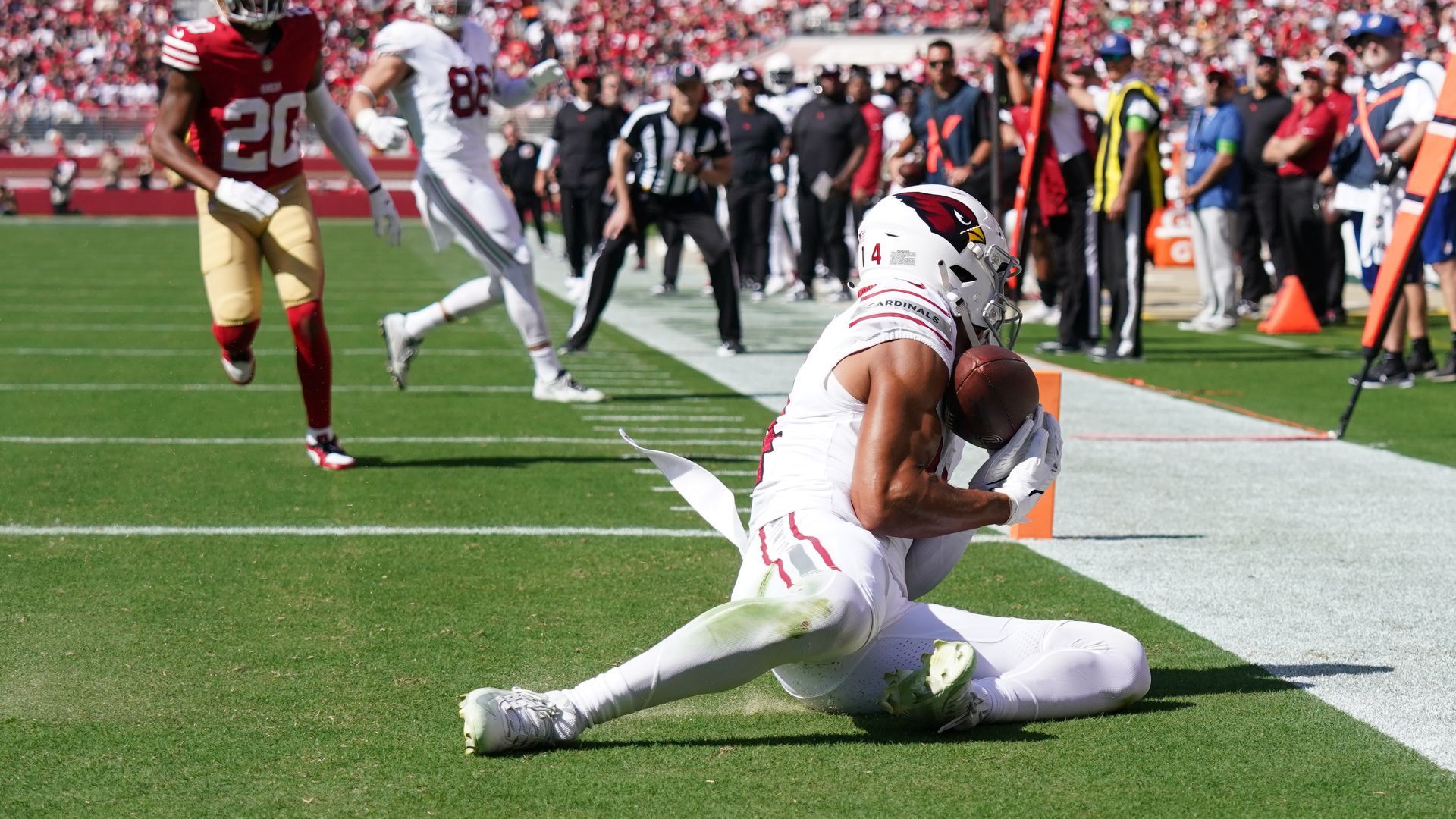 Oct 1, 2023; Santa Clara, California, USA; Arizona Cardinals wide receiver Michael Wilson (14) catches a touchdown against the San Francisco 49ers in the second quarter at Levi's Stadium. Mandatory Credit: Cary Edmondson-USA TODAY Sports