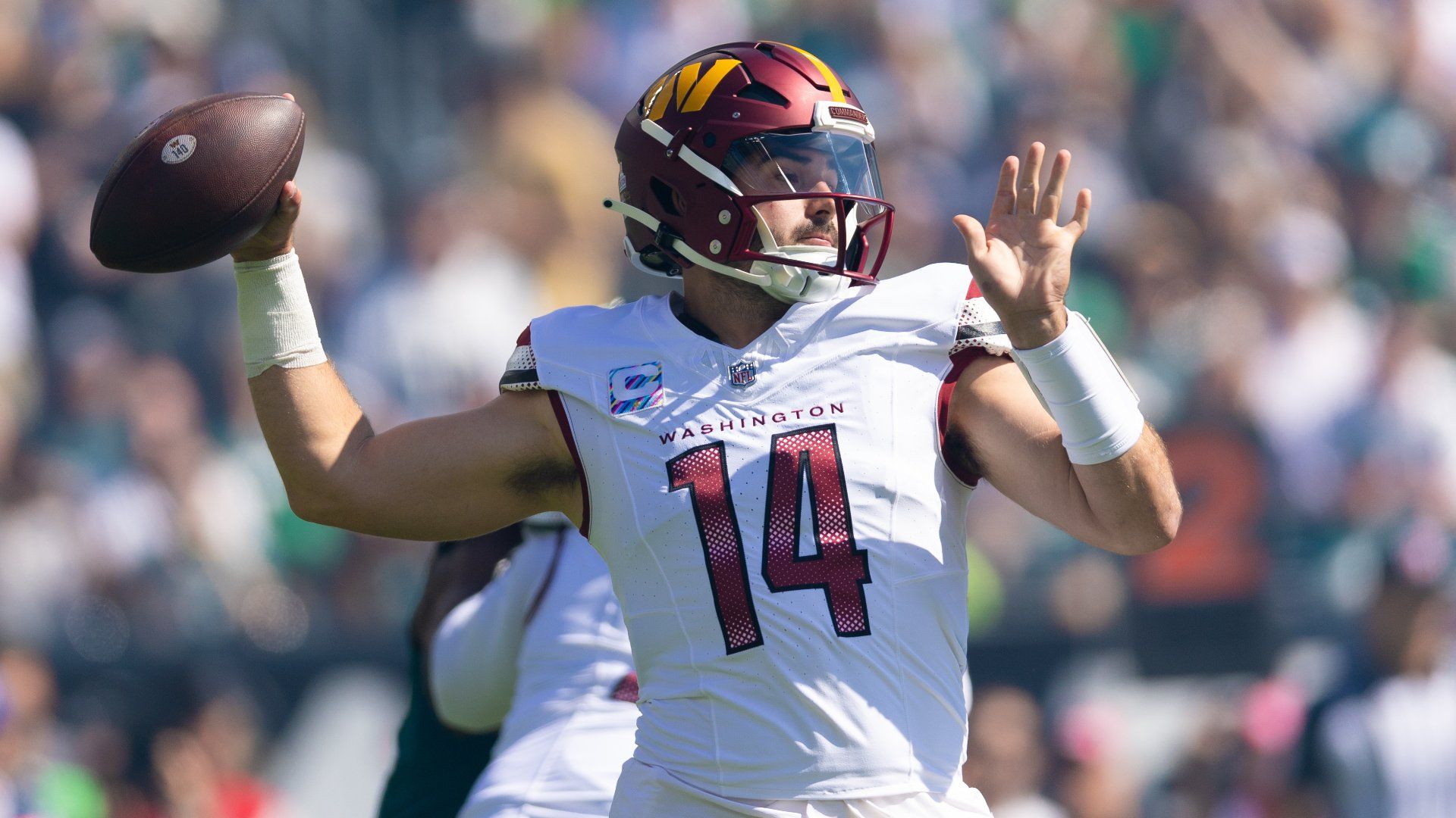Oct 1, 2023; Philadelphia, Pennsylvania, USA; Washington Commanders quarterback Sam Howell (14) passes the ball against the Philadelphia Eagles during the first quarter at Lincoln Financial Field. Mandatory Credit: Bill Streicher-USA TODAY Sports