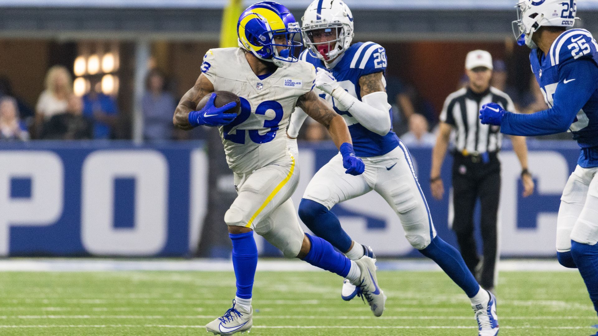 Oct 1, 2023; Indianapolis, Indiana, USA; Los Angeles Rams running back Kyren Williams (23) runs the ball in the second quarter against the Indianapolis Colts at Lucas Oil Stadium. Mandatory Credit: Trevor Ruszkowski-USA TODAY Sports