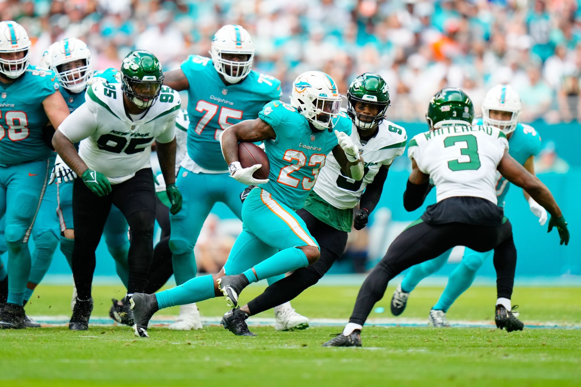 Jan 8, 2023; Miami Gardens, Florida, USA; Miami Dolphins running back Jeff Wilson Jr. (23) runs the ball as New York Jets safety Jordan Whitehead (3) pressures during the second quarter at Hard Rock Stadium. Mandatory Credit: Rich Storry-USA TODAY Sports