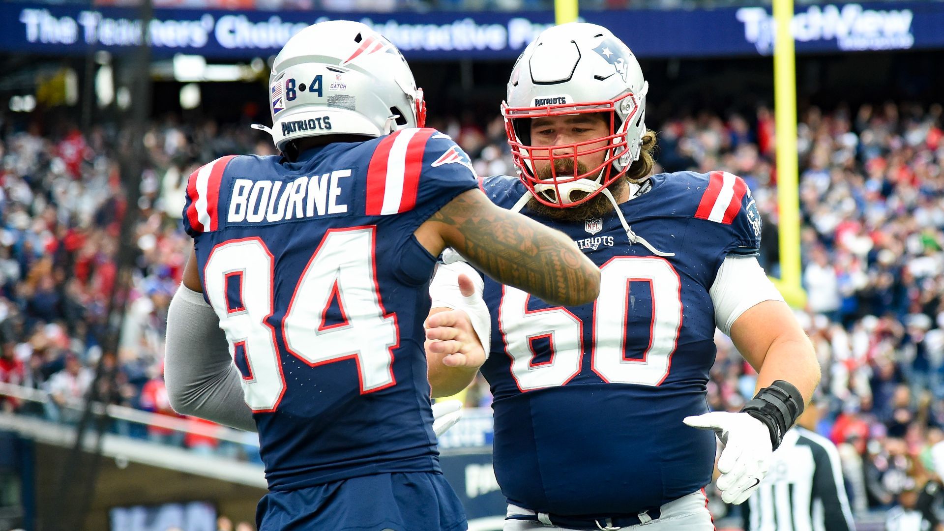Oct 22, 2023; Foxborough, Massachusetts, USA; New England Patriots wide receiver Kendrick Bourne (84) and center David Andrews (60) celebrate after a touchdown during the second half against the Buffalo Bills at Gillette Stadium. Mandatory Credit: Bob DeChiara-USA TODAY Sports