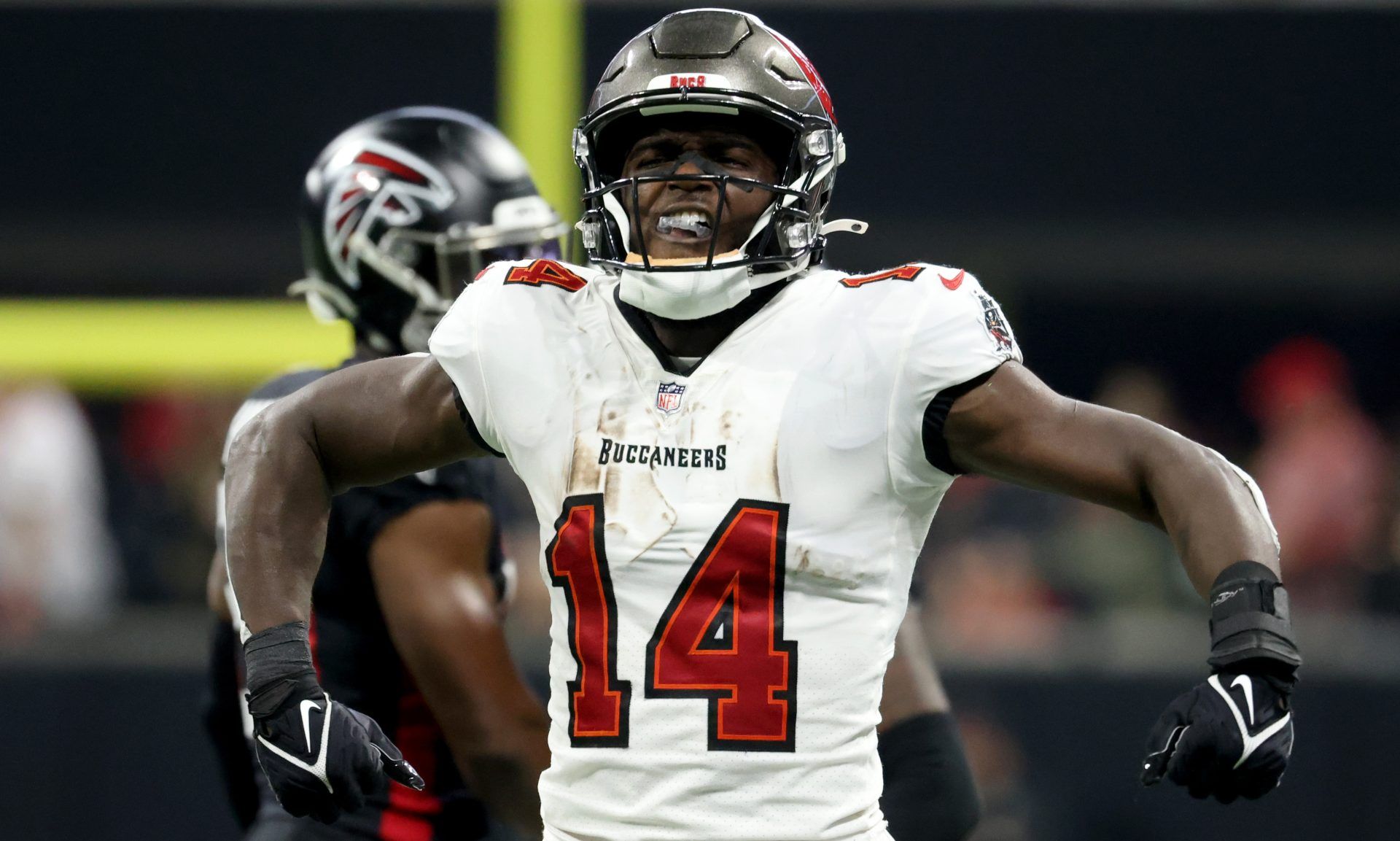 Dec 5, 2021; Atlanta, Georgia, USA; Tampa Bay Buccaneers wide receiver Chris Godwin (14) reacts after making a catch during the fist quarter against the Atlanta Falcons at Mercedes-Benz Stadium. Mandatory Credit: Jason Getz-USA TODAY Sports