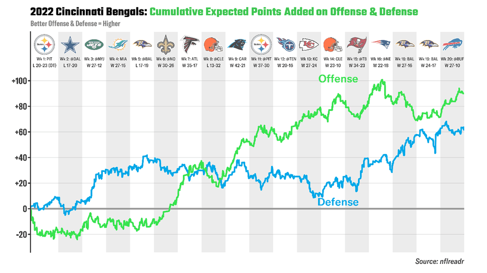 For instance, let's look at the Bengals' cumulative EPA below heading into the 2022 AFC Championship game.