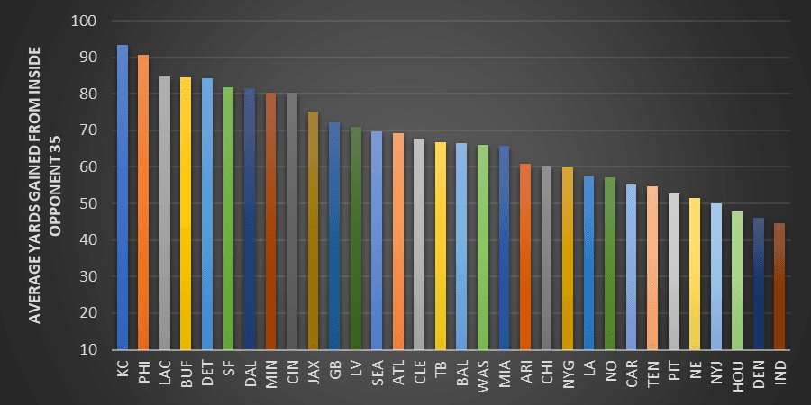 When looking at average yards gained from inside the opponent's 35-yard line, the Chiefs and Eagles remain at the top, but there's a reshuffling of the top 10, and the Bengals (rightfully) make an appearance. Overall, the more impactful teams from 2022 rise to the top.