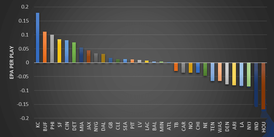 - The bottom-12 teams in EPA per play accounted for 84 of those.