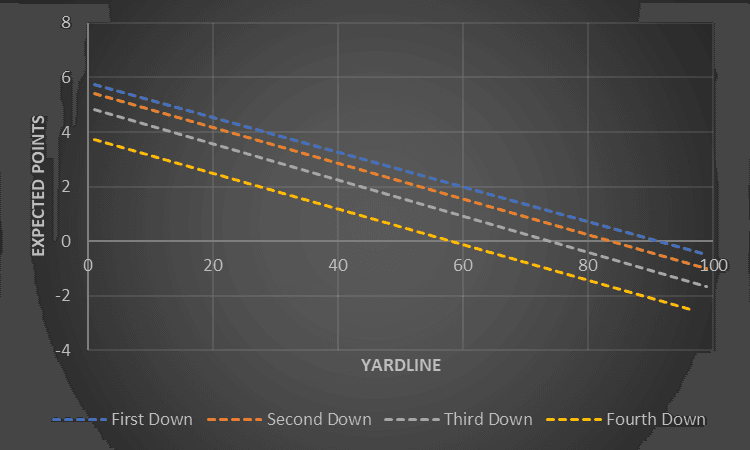As the down increases from first to fourth (or third down in many cases), an offensive unit has fewer tries to reset the count, which in turn lowers their scoring prospects. Therefore, EP should decrease as a team creeps toward fourth down.