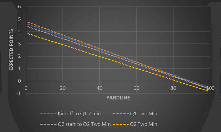 EP is at its highest right after the kickoff. At that point, play callers have the entire game to get into a rhythm, identify what does and doesn’t work, and make adjustments. However, things change during the final two minutes of a half.