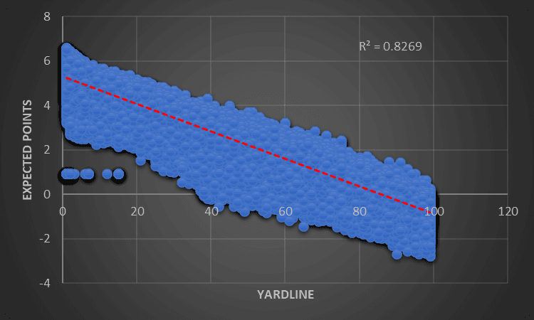 A five-year sample of regular-season offensive plays visualizes what we already knew was true. Distance to the end zone and expected points are highly correlated. With an r-squared value of 0.83, the data agrees with our intuition that field position affects a team’s chance to score. So, let’s use the same logic path.