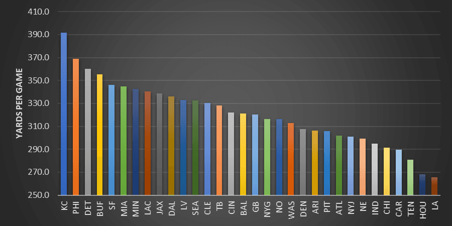 In 2022, the Chiefs led the league in yards per game, and the Eagles, Lions, Bills, and 49ers rounded out the rest of the top five. All five of these teams were offensive juggernauts, so this shouldn't exactly be breaking news.