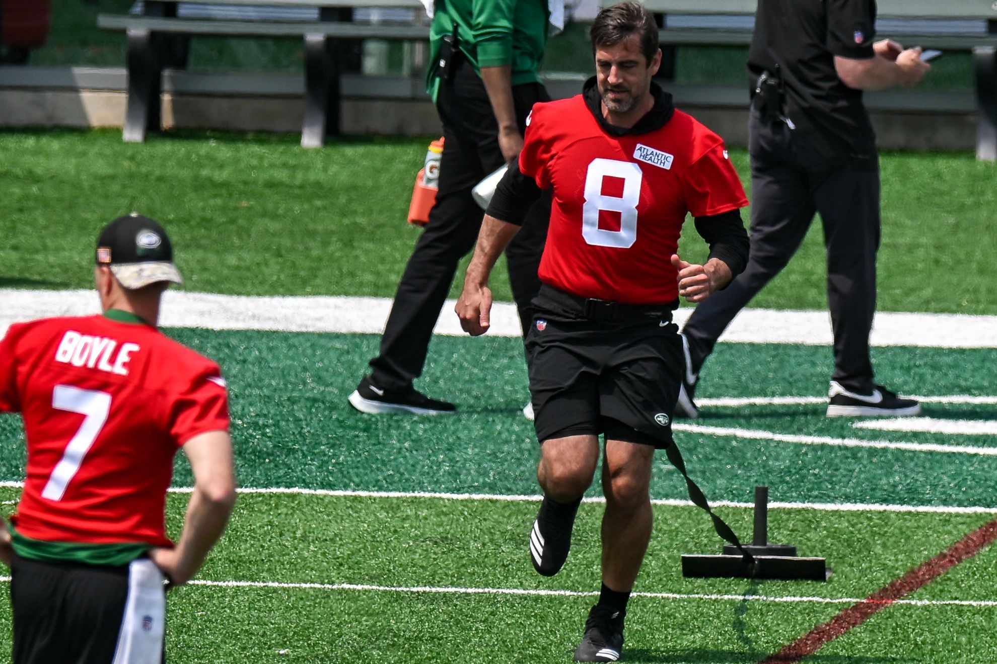 May 23, 2023; Florham Park, NJ, USA; New York Jets quarterback Aaron Rodgers (8) warms up during OTA s at Atlantic Health Jets Training Center. Mandatory Credit: Jonathan Jones-USA TODAY Sports
